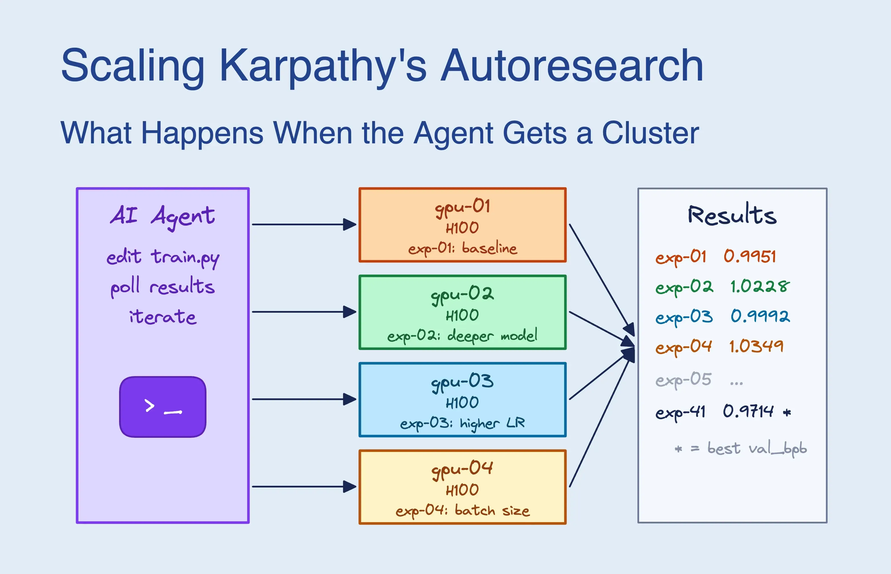 Parallelism changes the agent’s search strategy. Instead of greedy sequential hill-climbing, it explores a grid — testing multiple hyperparameters simultaneously and cross-referencing results. The agent also independently discovered a two-tier strategy: screening hypotheses on cheaper H100s, then promoting winners to faster H200s, without being told to do so.